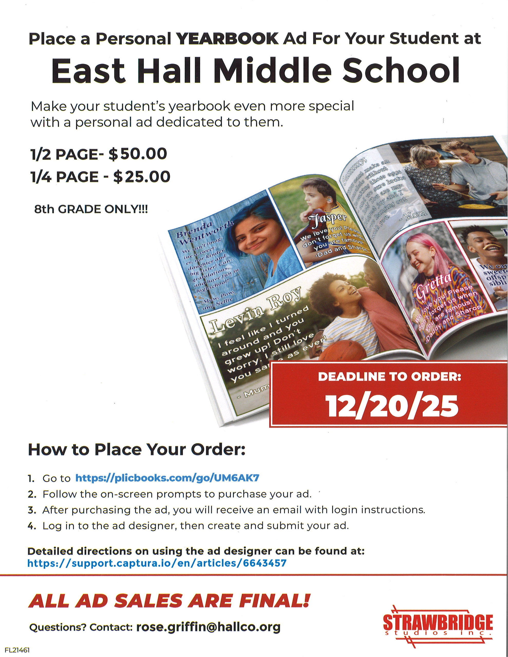 Place a Personal YEARBOOK Ad for your 8th Grade Student at East Hall Middle